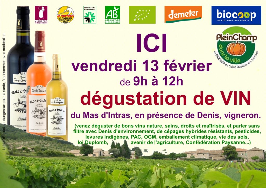 De 9h à 12h, présentation et dégustation des vins du MAS D’INTRAS, en présence de Denis, vigneron